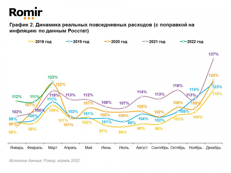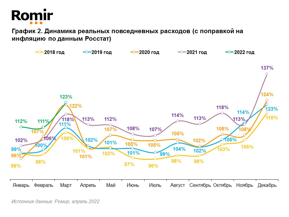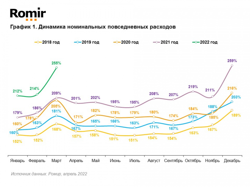 В марте 2022 года индекс повседневных номинальных расходов россиян составил 255% - на 41 п.п. (19,2%) больше, чем в феврале. Об этом сообщил исследовательский холдинг Romir в своём ежемесячном отчете. Согласно результатам исследований, в годовой динамике индекс увеличился на 46 п.п. (22%).