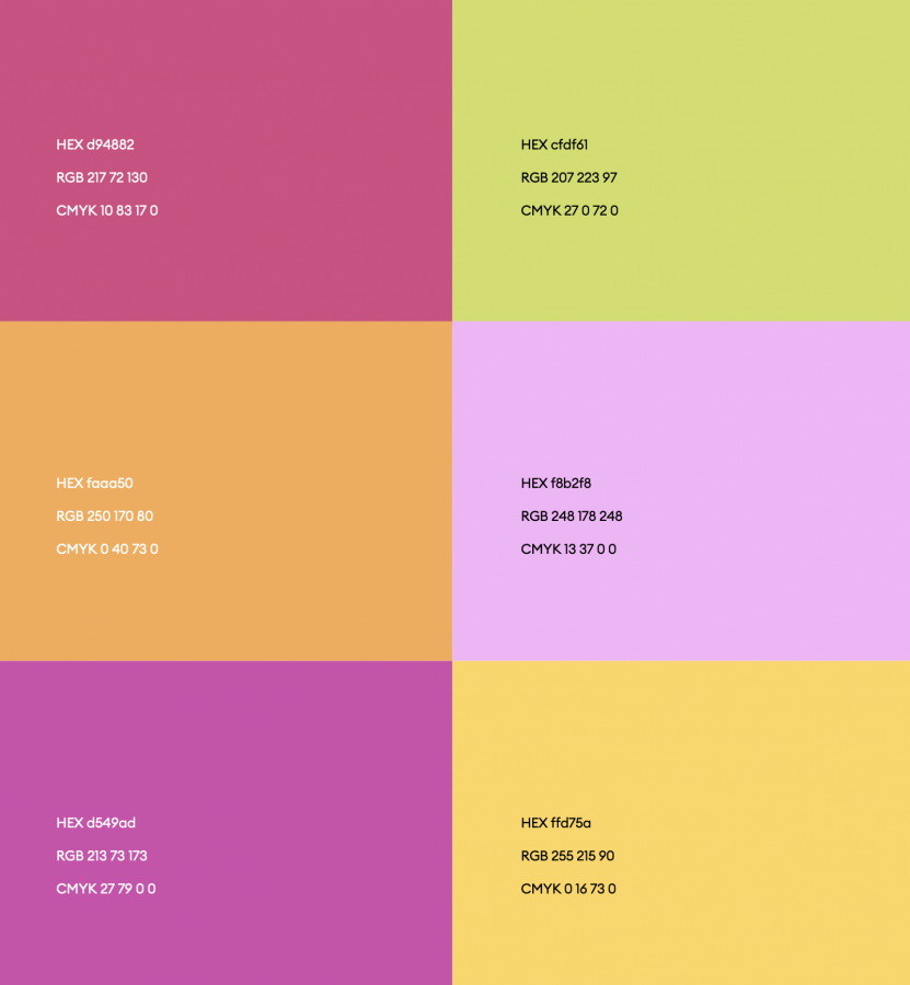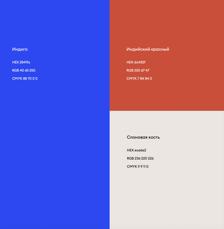 «Индийский красный» ассоциируется со страной происхождения основного ассортимента проекта, а так же создаёт с синим цветом контрастную пару, усиливающую связь с Индией. Цветовая пара является единственным сочетанием для фирменного блока. В качестве фона используется цвет слоновой кости. Кроме того, существует ещё дополнительная палитра, которая используется во всех материалах проекта.