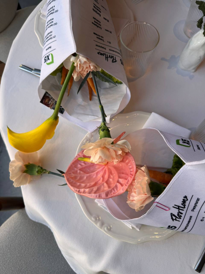 Чтобы подчеркнуть роль этих людей в повседневной жизни, компания подготовила для гостей комплимент — букеты из овощей и цветов от FlorHome, упакованные в «кассовый чек», где вместо цен указано, сколько труда стоит за каждым букетом.