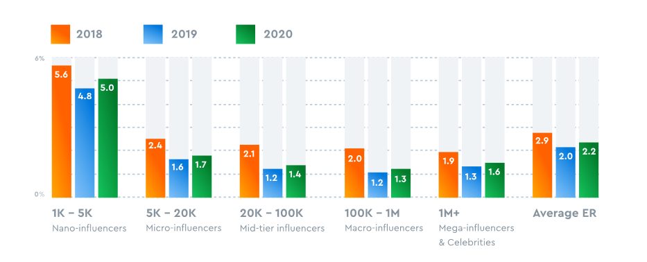 Аналитики изучили более 12 млн аккаунтов Instagram, 4,5 млн канала YouTube и 5,2 млн аккаунтов TikTok в течение всего 2020 года. ER нано-инфлюенсеров Instagram (от 1 тыс. до 5 тыс. подписчиков) составил 5%. С ростом числа подписчиков этот показатель снижается, у мега-инфлюенсеров он составляет 1,6%.