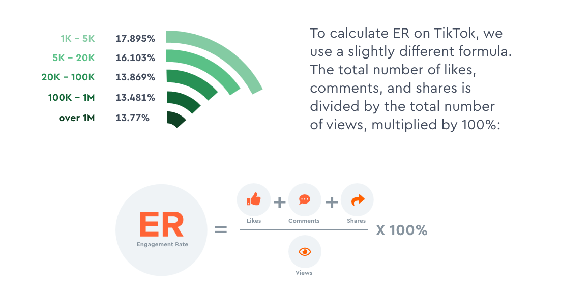 В TikTok ситуация иная. HypeAuditor выяснили, что хотя показатели охвата снижаются с ростом числа подписчиков, разница между нано- (ER=17,9%) и мега-инфлюенсерами (ER=13,8%) не такая значительная, как в Instagram. При подсчете учитывалось соотношение суммы лайков, комментариев и «шеров» к количеству просмотров.