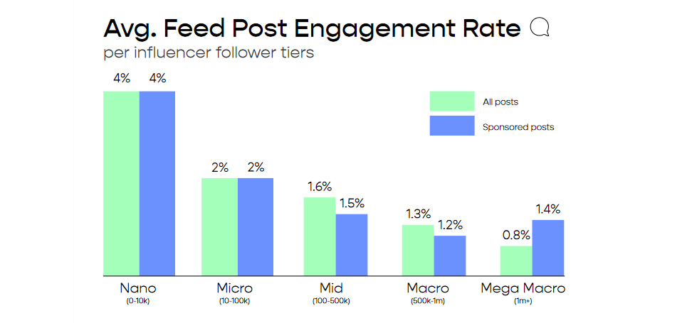 Похожие данные приводятся в отчете Later и Fohr, которые проанализировали 3,5 млн постов в Instagram в период с декабря 2020 года по март 2021 года. По их данным, нано-инфлюенсеры (до 10 тыс. подписчиков) имеют ER 4%, мега-инфлюенсеры — 0,8% для обычных постов и 1,4% для рекламных. В обоих отчетах ER — соотношение лайков и комментариев к числу подписчиков.