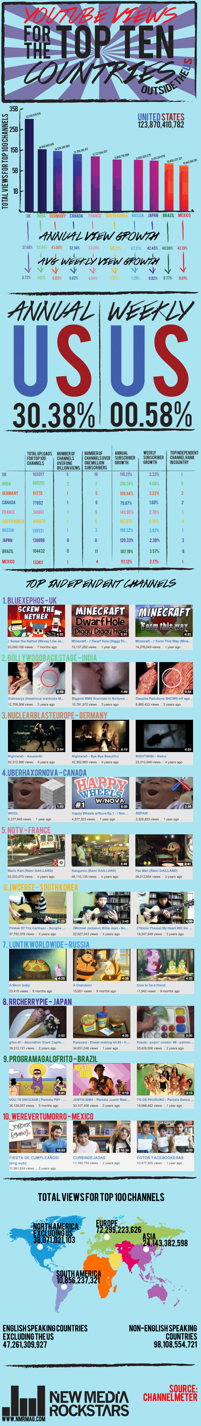 Лидером рейтинга стали США с рекордным количеством просмотров – 123,8 млрд. Российские пользователи просмотрели ролики на сотне самых популярных каналов YouTube 11,5 млрд раз. В десятку также вошли Великобритания, ставшая крупнейшим рынком YouTube за пределами Соединенных Штатов, Индия, Германия, Канада. Франция, Южная Корея, Япония, Бразилия и Мексика.