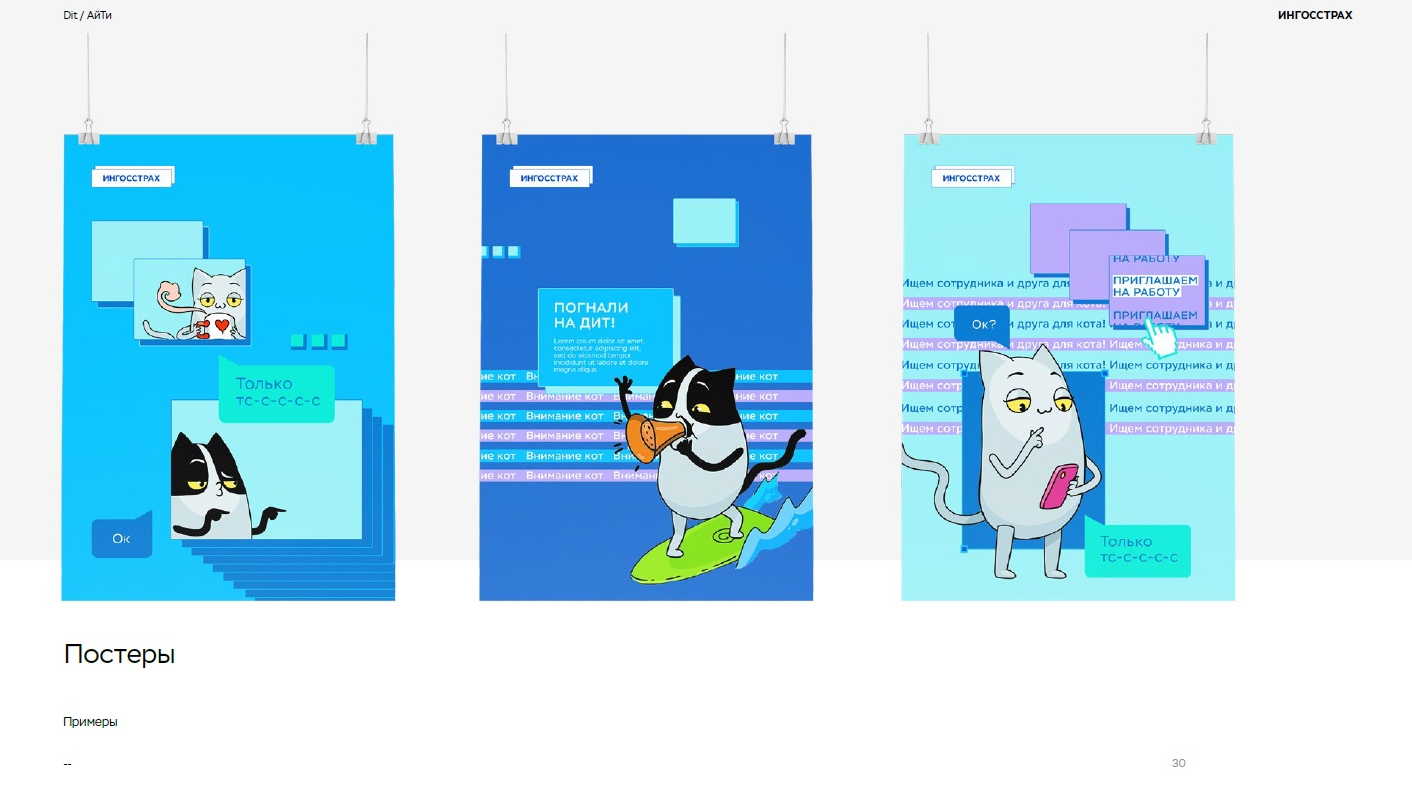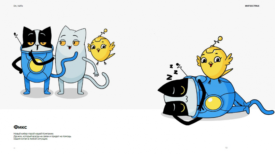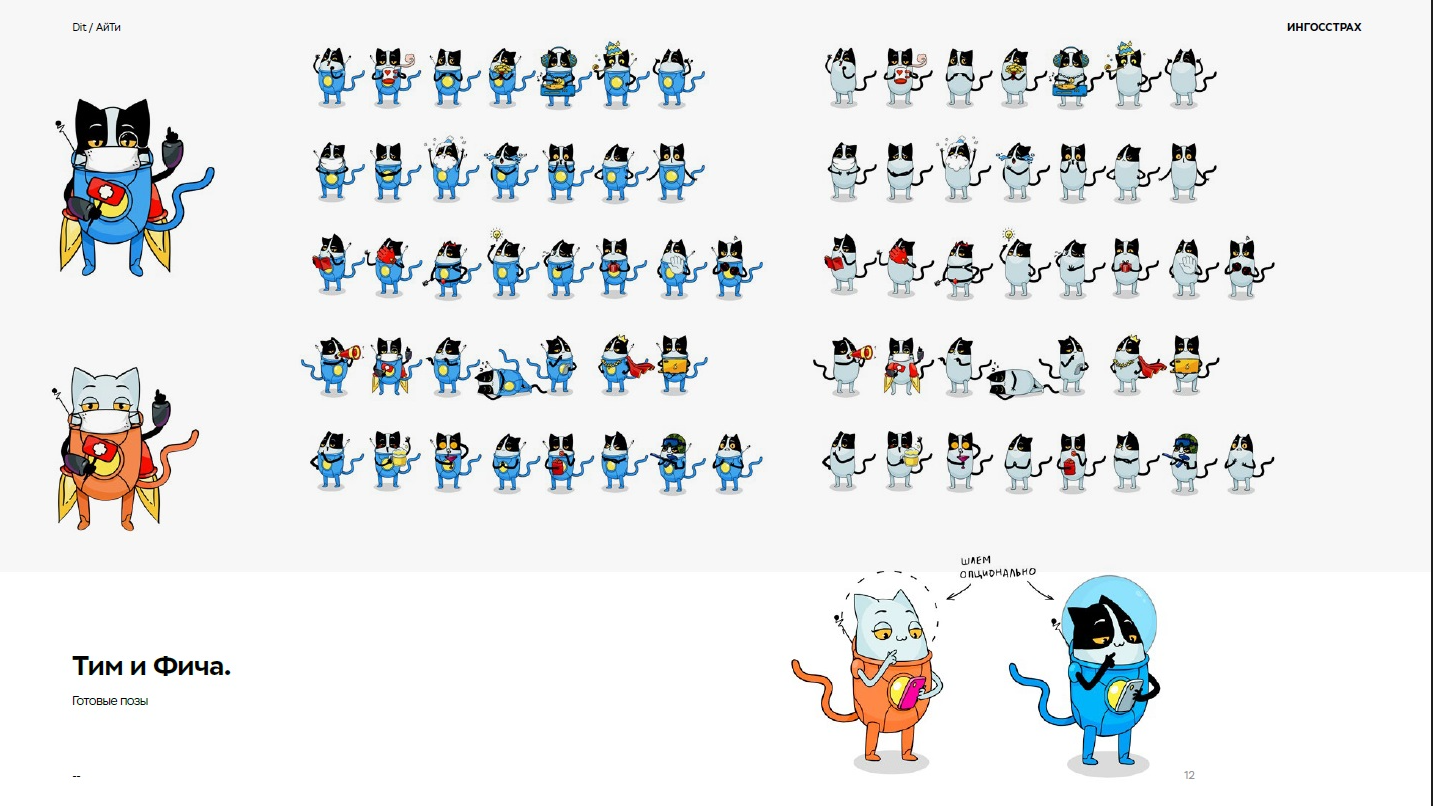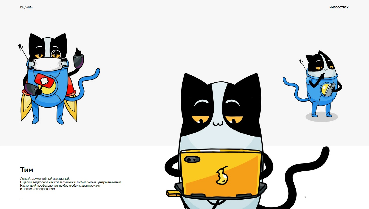 Чтобы сохранить преемственность, героями обновленного фирменного стиля остались давно знакомые сотрудникам Департамента информационных технологий коты-айтишники Тим (от англ. «Team» — команда) и Фича (на сленге ИТ — дополнительная опция, от англ. «Feature»). Коты появились в «Ингосстрахе» около 5 лет назад и сразу стали частью ИТ-команды: им дали имена, стали использовать в рассылках, и со временем вся компания привыкла к ним. Любимых героев решили оставить и «прокачать»: теперь им стал доступен большой спектр эмоций и действий — они занимаются спортом, отдыхают, работают, любят и злятся.