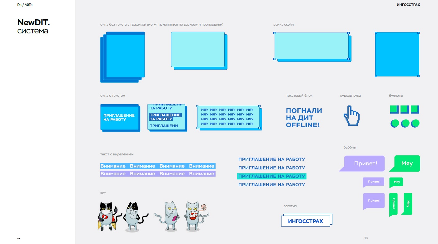 Также в системе обновленного фирменного стиля представлена новая цветовая палитра, композиции для дизайна корпоративных рассылок, примеры постеров и кастомных точечных кампаний с присутствием ИТ-котов.