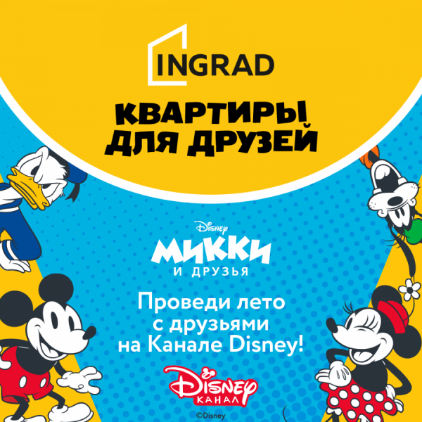 Летом 2020 года на улицах Москвы, в мировой паутине, в рамках тематических уикендов и в эфире уникального цифрового радио Disney можно было увидеть и услышать кампанию «INGRAD. Мой центр детства. Квартиры для друзей». В рекламных макетах фирменная желтая плашка INGRAD гармонировала с ярким голубым макетом, анонсировавшим летние программы Канала Disney с одними из самых известных персонажей в истории анимации — Гуфи, Дональдом Даком, Минни и Микки Маусом.