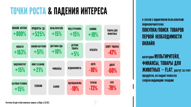 Но здесь важнее другое: если в докоронавирусном мире единственным барьером для повсеместного распространения e-commerсe было определенное желание потребителя «посмотреть на товар вживую, убедиться в его качестве и соответствии описанию и визуальной презентации», в отдельных случаях — недоверие к качеству товара или сроку годности (в случае со свежими продуктами), то в пост-коронавирусном мире все эти барьеры будут сняты. За время изоляции потребители поймут и оценят удобство онлайн-покупок. И тот импульс, который получит e-commerce в этот период, будет сказываться в дальнейшем. С другой стороны, те категории и рекламодатели, которые раньше не были готовы инвестировать в электронную коммерцию, смогут полноценно ощутить привлекательность данного направления.