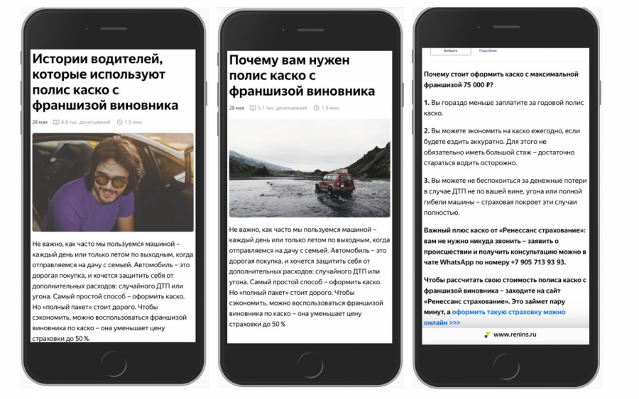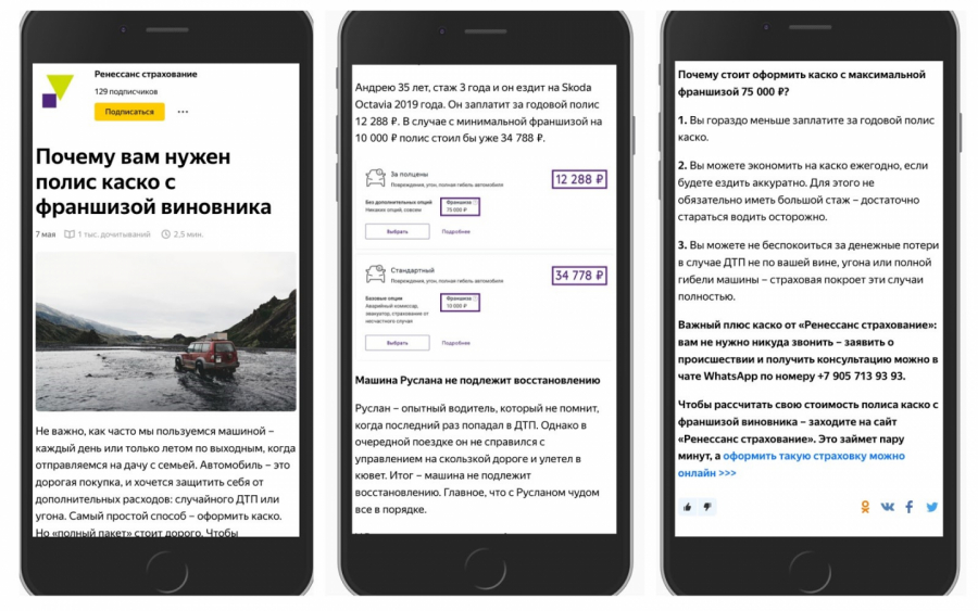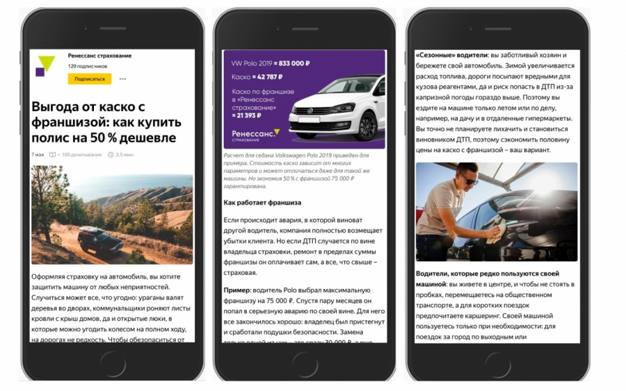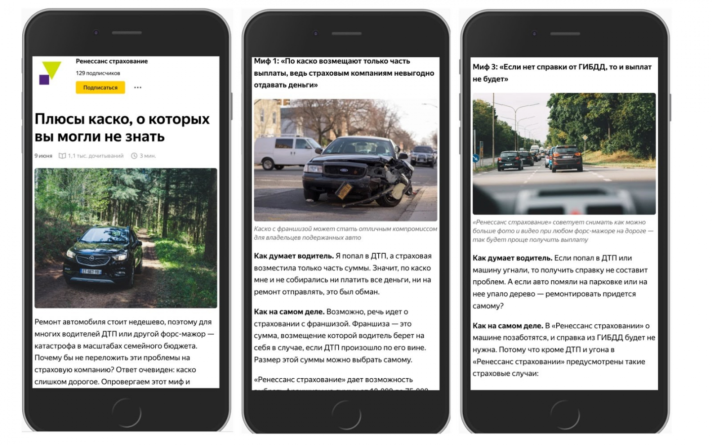 Мы постоянно ищем новые решения, технологии, площадки и интересные форматы для продвижения брендов клиентов и очень благодарны компании «Ренессанс страхование» за готовность участвовать в этом эксперименте. «Ренессанс страхование» как прогрессивный рекламодатель одним из первых в категории автострахования зашел на территорию «Яндекс.Дзена», чтобы тестировать и развивать этот инструмент как рекламную площадку для продвижения сложных продуктов.