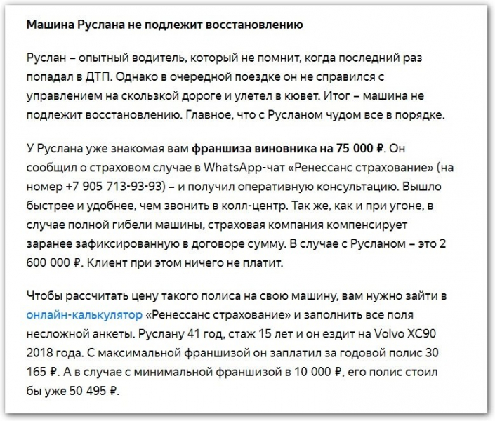 Cторителлинг с примерами применения страхового продукта. В статью добавили истории автовладельцев о проблемах с авто: машину Оли помял лихач, машину Андрея угнали у ТЦ, машина Руслана попала в аварию и не подлежит ремонту. И все герои получили ремонт или деньги по страховке. Истории сделали на основе реальных кейсов клиентов. В каждом примере расписали расчеты и экономию при использовании продукта «Ренессанс страхование».