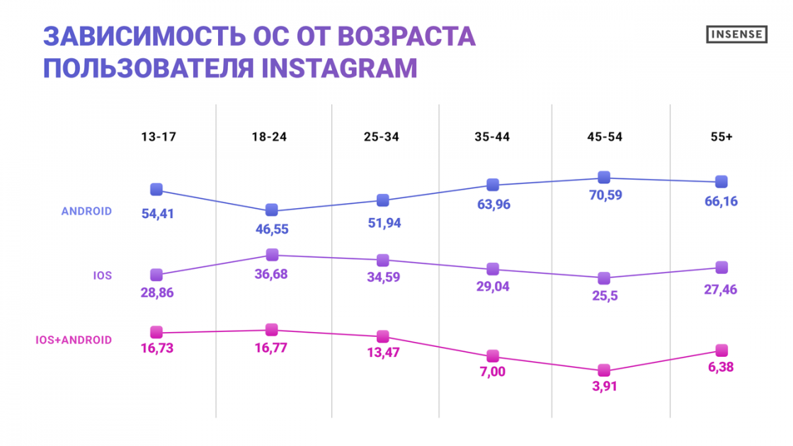 К преобладанию Android во всех возрастах привел шестикратный рост пользователей устройств на базе ОС в возрасте 45−54. Эксперты предполагают, что для существенной части этих людей имеет место не переход с Apple на Android, а покупка первого смартфона. Об этом косвенно свидетельствует сокращение доли пользователей гаджетов с обеими операционными системами на 63,1% по сравнению с прошлым годом. Среди людей среднего возраста аудитория c ОС Android выросла в четыре раза. Устройствами с обоими типами ОС в среднем располагают 11,5% пользователей Instagram, этот показатель выше в молодых когортах (до 16,7%), представители которых чаще обновляют технику.