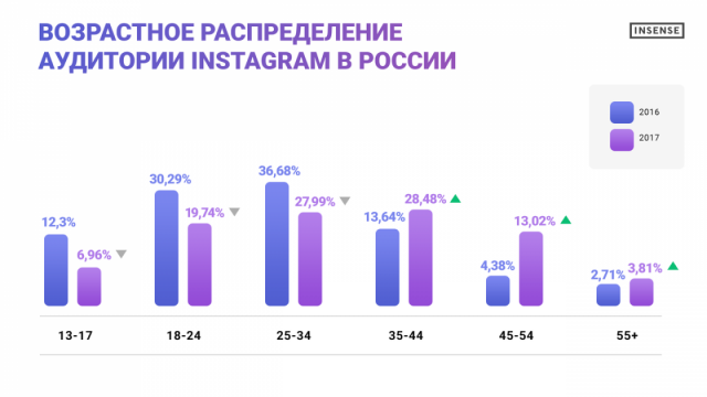 Основной прирост российской аудитории Instagram пришелся на регионы, а самым быстрорастущим сегментом оказался 35+. За 2017 год количество пользователей старше 35 лет увеличилось почти в четыре раза. Доля молодых пользователей (13−34) упала с 79,3% до 54,7%.