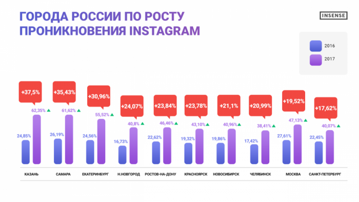 Доля московских аккаунтов в сервисе сократилась на 13,8%, тогда как годом ранее столица была лидером по концентрации пользователей — там Instagram пользовалось 27,6% населения. Зато сейчас аккаунт есть почти у половины жителей Москвы (47,1%). Санкт-Петербург также далек от лидирующей позиции, хотя аккаунт есть у 40% населения города. Всего в 15 крупнейших городах-миллионерах России сосредоточено 22,5% населения, половина из которых (49,9%) — пользователи Instagram.