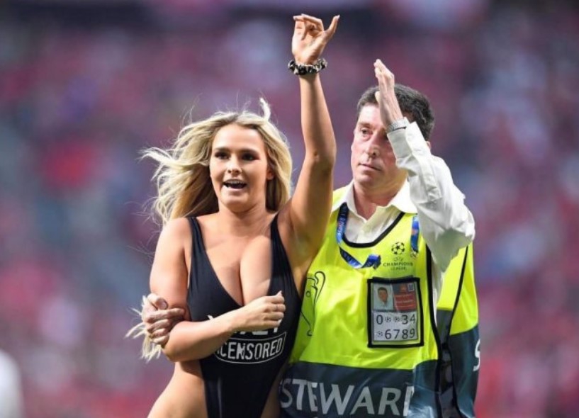 Кинси Волански выбежала на поле во время финала Лиги чемпионов между «Ливерпулем» и «Тоттенхэмом» в купальнике без символики принимавших участие в матче клубов. Судья был вынужден остановить матч, пока девушку не вывели с поля.