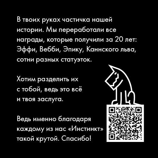 В этом году Instinct исполнилось 20 лет. Креативное агентство было создано в начале 2003 года и сразу вошло в число лидеров рекламного рынка. Работы Instinct неоднократно становились призерами и финалистами таких престижных фестивалей рекламы, как Golden Drum, London International Awards, Golden Hammer, ADCR. В честь своего юбилея команда агентства выпустила манифест.