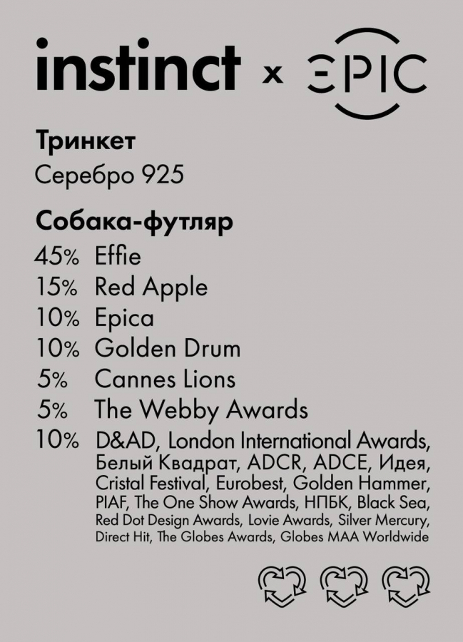 Instinct переработал все награды, которые получил за 20 лет существования агентства. А партнёры Instinct — Epic Jewellery — разработали и изготовили из статуэток оригинальные памятные тринкеты для всех сотрудников и партнёров агентства. Креативщики положили под пресс Каннского льва, Большую рыбу, награды Red Apple, White Square, Серебрянного Меркурия и многие другие престижные призы. Как пояснили в агентстве, этот перформанс — доказательство того, что главное не награды, а люди.
