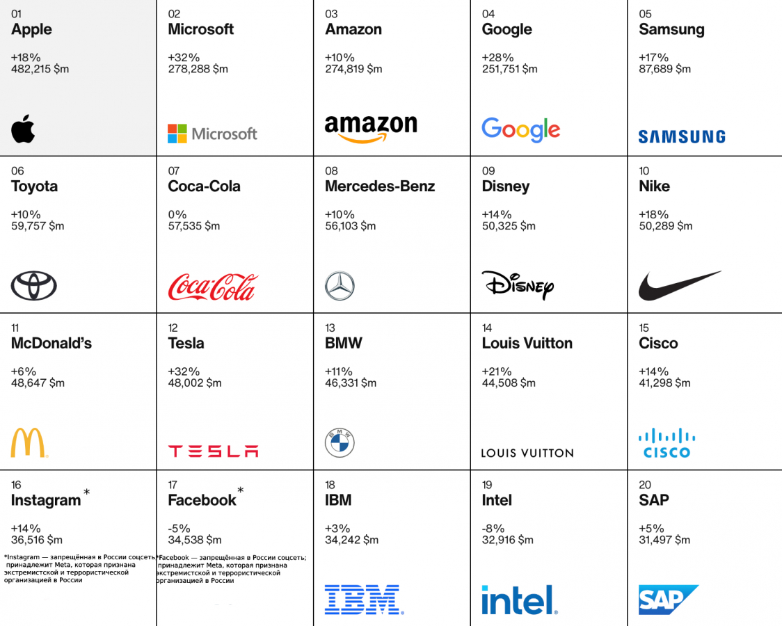 В прошлом году топ-100 также возглавляла Apple, чья стоимость достигла $408,3 млрд (+26% за год). На втором месте был Amazon со стоимостью $249,3 млрд (+24%), а на третьем — Microsoft, который оценивался в $210,2 млрд (+27%). Общая стоимость 100 самых дорогих брендов мира составила $2,3 трлн.