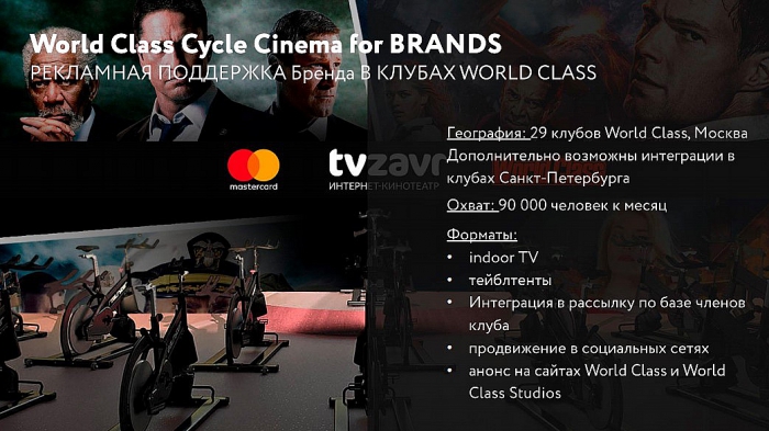 В рамках рекламного продукта «Offline-to-onlineretargeting», компании предлагают широкие возможности интеграции бренда клиента. Так, например, клиент может интегрироваться в Indoor TV, тейблтенты на территории фитнес-клубов World Class. Помимо этого, предоставляется возможность брендирования зон Cycle Cinema. Кроме того, информация о бренде клиента интегрируется в e-mail рассылку по членам фитнес-клубов, а также дублируется на сайте World Class и всех платформах онлайн-кинотеатра Tvzavr.