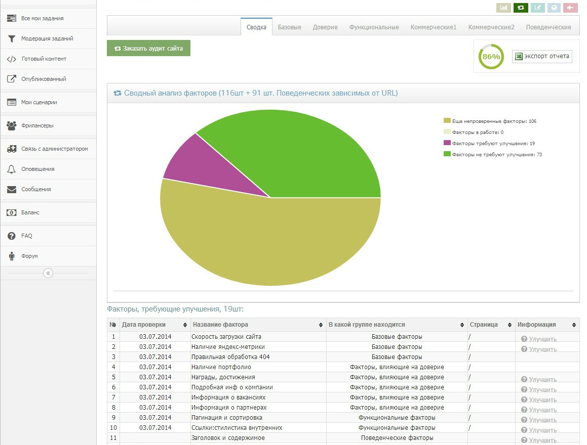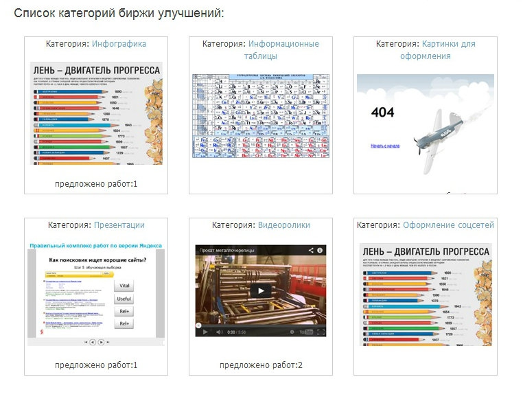 Устранив технические недочеты (например, установка счетчика Яндекс.Метрики на все страницы сайта), оптимизатор может переходить к бирже улучшений, где фрилансеры готовы продать заказчику за фиксированную плату любую работу по его заявке – сделать презентацию, видеоролик, инфографику, информационную таблицу, картинки (например, для оформления страницы ошибки 404) и оформление соцсетей.