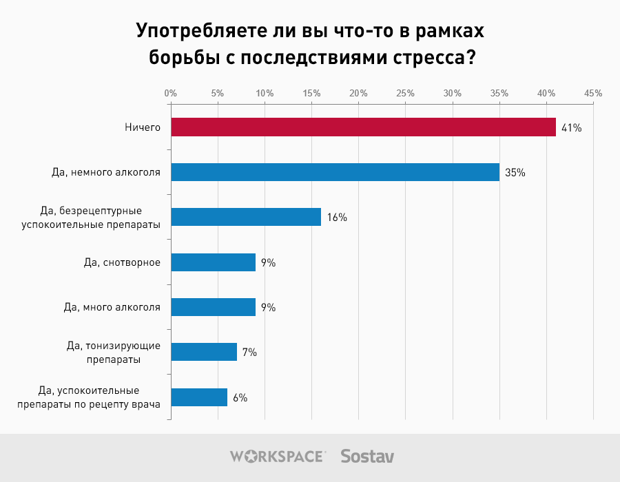 41% опрошенных предпочитают самостоятельно справляться со стрессом, не используя какие-либо препараты или напитки. Многие из них написали нам в комментариях, что в качестве разгрузки стараются заниматься спортом или с головой погружаться в хобби.