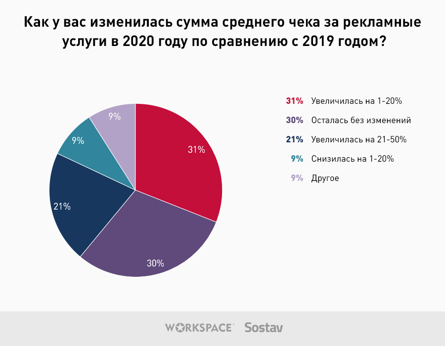 Более половины агентств смогли увеличить свой средний чек. Среди основных причин: ориентир на выигравшие от пандемии отрасли бизнеса, смена специализации агентств, доппродажи за счет новых услуг. У 9% сумма среднего чека ожидаемо снизилась из-за сокращения бюджетов заказчиков.