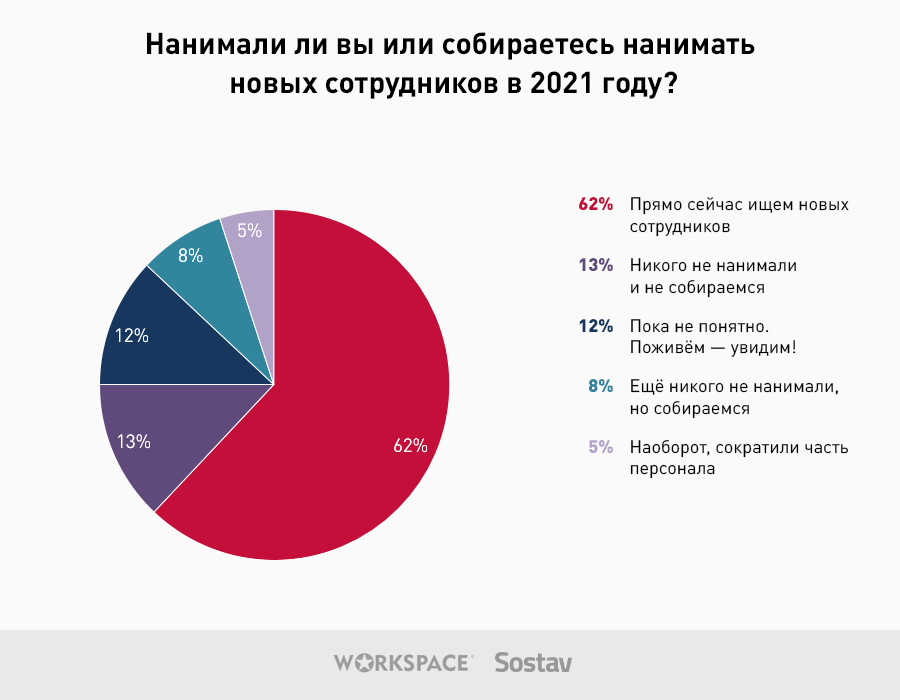 Если в прошлом году многие агентства пошли на незначительные сокращения, то в этом году ситуация нормализуется. 70% агентств собираются привлекать новых сотрудников в ближайшем будущем, причем 62% из них делают это прямо сейчас. Поиск сотрудников — это не всегда масштабирование агентства. Зачастую это попытка вернуться к докризисным показателям или точечная замена сотрудников, увольняющихся по собственному желанию.