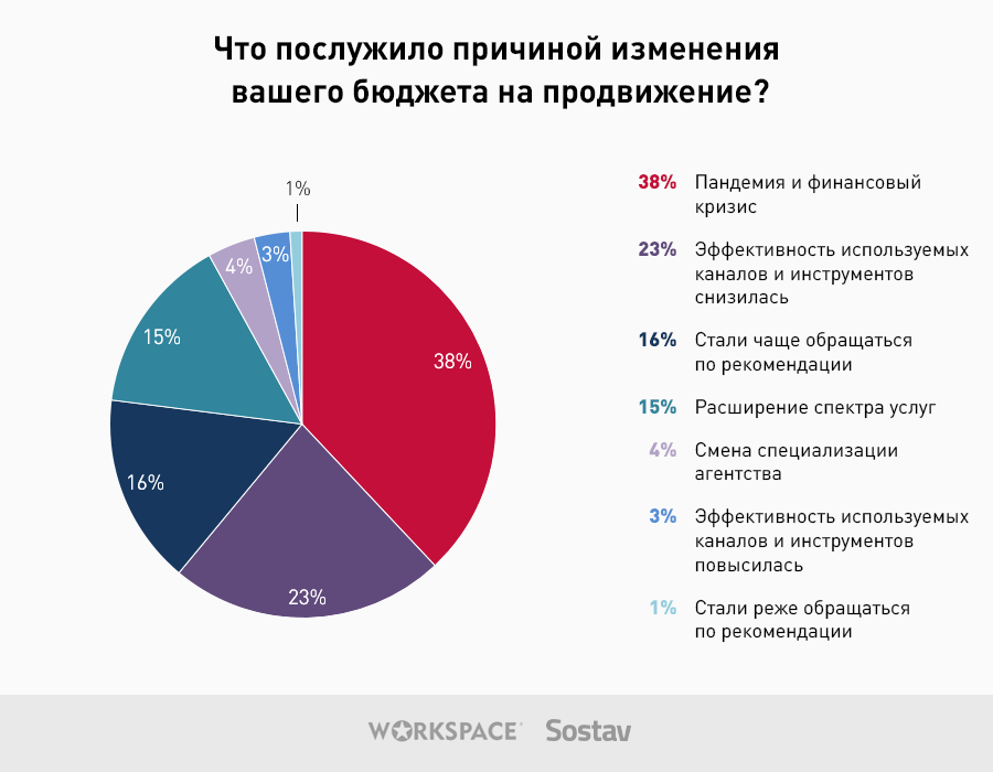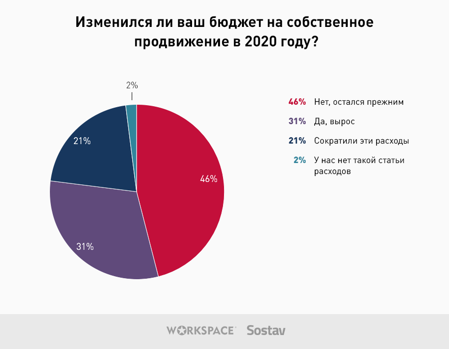 31% агентств в 2020 году стали тратить на собственную рекламу больше, чем в 2019-м. Зачастую это было связано с расширением линейки услуг или сменой специализации заказчиков. 21% сократили свои расходы на продвижение; у 5% эта мера была вызвана необходимостью сократить расходы в целом.