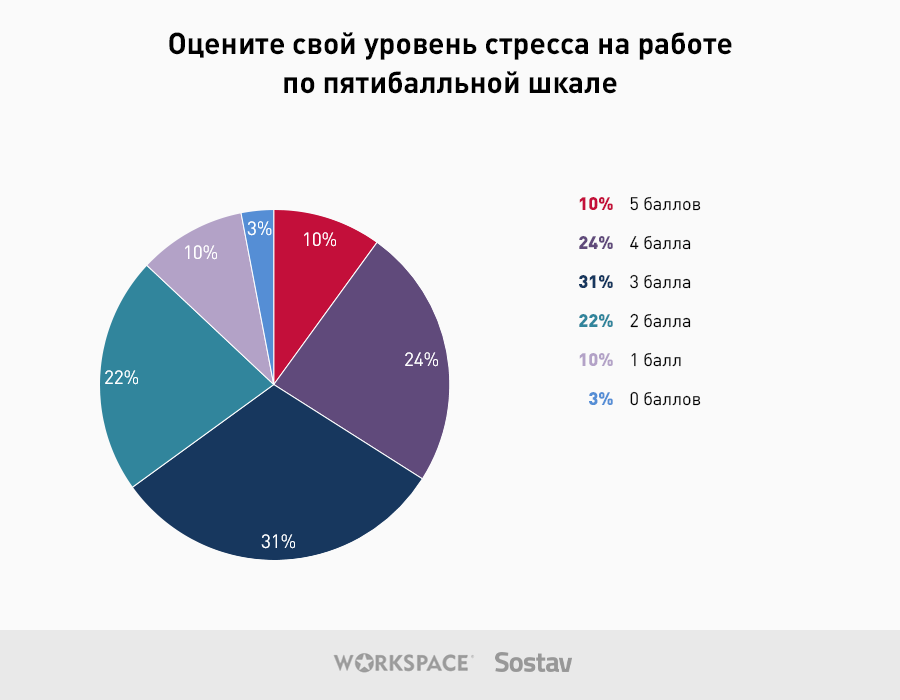 Респонденты оценили свой уровень стресса по пятибалльной шкале. 3% заявили, что уровень их стресса равен нулю. Более трети (34%) находятся в состоянии повышенного стресса, который они оценили на 4 и 5 баллов. Исследователи также считают оценку в 3 балла тревожной — 31% опрошенных находятся в зоне риска выгореть на работе.