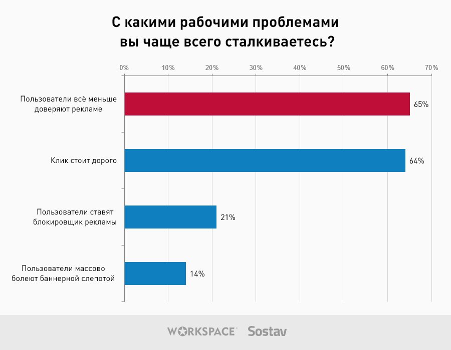 Наиболее распространенные проблемы связаны с внешними трендами: онлайн-пользователи все меньше доверяют рекламе и ставят блокировщики, а также все хуже реагируют на баннерную рекламу. Стоимость кликов тоже не добавляет оптимизма. Среди прочих проблем: завышенные требования клиентов к качеству лидов, «скликивание» рекламы, недостаточно высокие зарплаты и конфликтные заказчики.