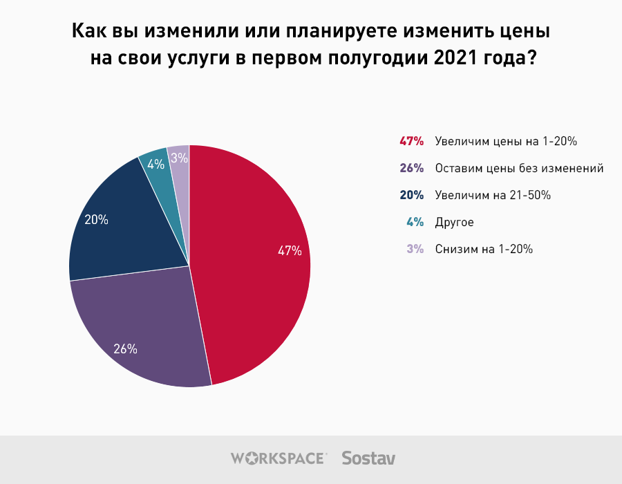 67% респондентов планируют или уже повысили свои цены в первой половине 2021 года. 26% не планируют их менять, однако некоторые из них подняли свой ценник в конце прошлого года. Снижение цен — скорее исключение из правила, на этот шаг готовы пойти лишь 3% опрошенных.