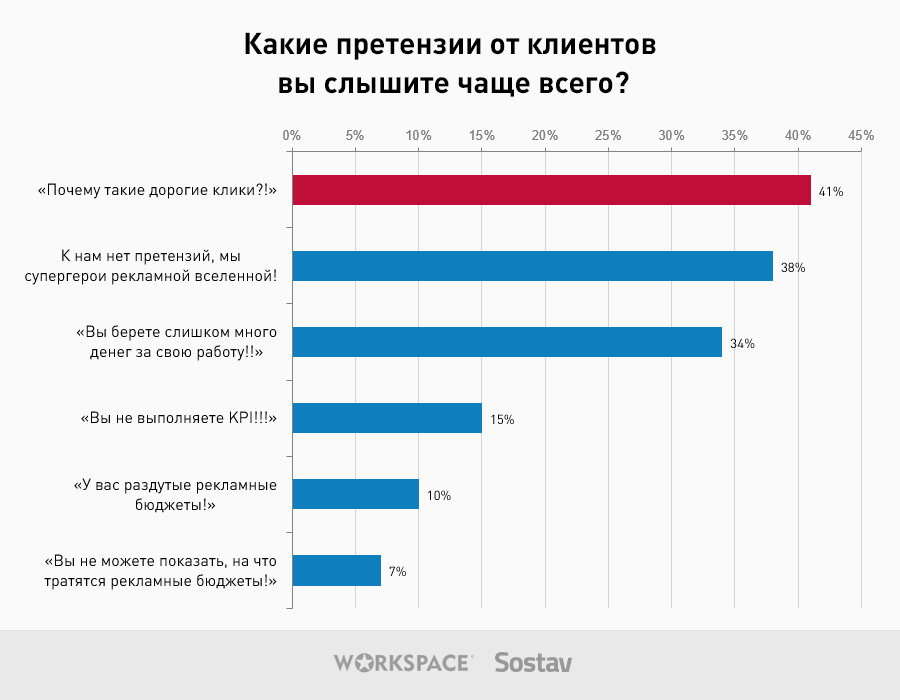 Респондентам предложили несколько готовых вариантов ответов. Самой распространенной претензией стало негодование по поводу высоких рекламных ставок. 38% опрошенных заявили, что не сталкиваются с претензиями со стороны клиентов.