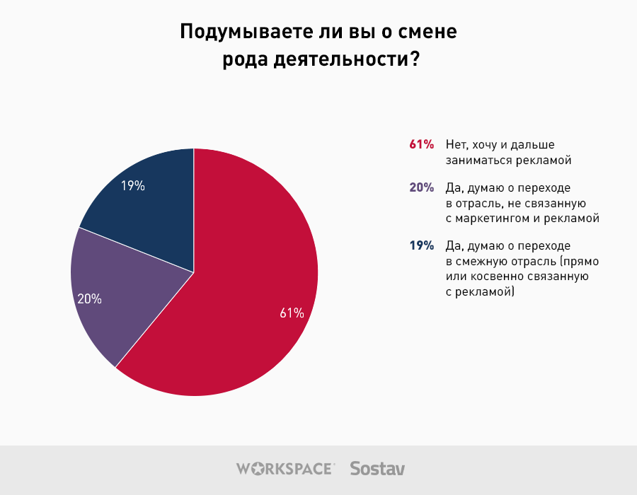 Неудивительно, что 39% респондентов подумывают о смене профессии или переходе в смежную отрасль. Исследователи отмечают, что руководителям агентств и специалистам, отвечающим за кадровый вопрос, важно обратить внимание на этот факт и найти решения, снижающие уровень стресса сотрудников или помогающие бороться с его последствиями.