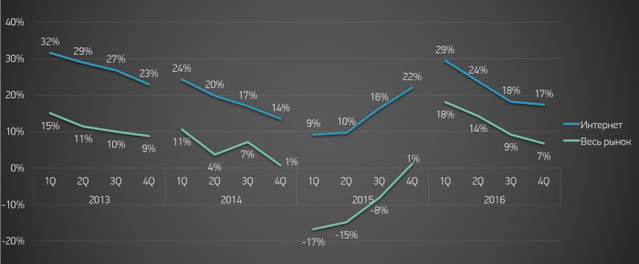 Со 2-го квартала 2014 года темпы роста интернета стали стремительно замедляться, достигнув минимальных значений в первом полугодии 2015 года. Начиная с 3-го квартала ситуация в сегменте изменилась к лучшему. Первыми начали оживать перфоманс-форматы, а возобновление роста традиционных интернет-форматов началось, как и у остального рынка, лишь в 4-м квартале. Начало 2016 года было ознаменовано крайне высоким ростом – сказался эффект низкой базы провального начала 2015 года, когда было нащупано кризисное «дно». Но ближе к концу 2016 года происходит закономерное замедление: начавшееся во второй половине 2015 года восстановление рынка сформировало высокую базу для сравнения.