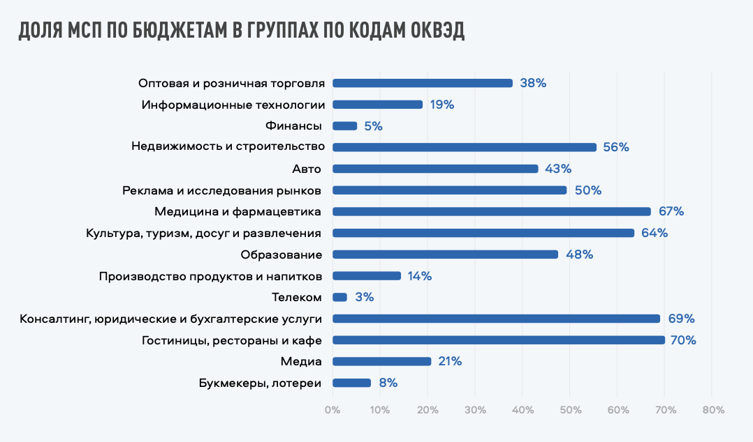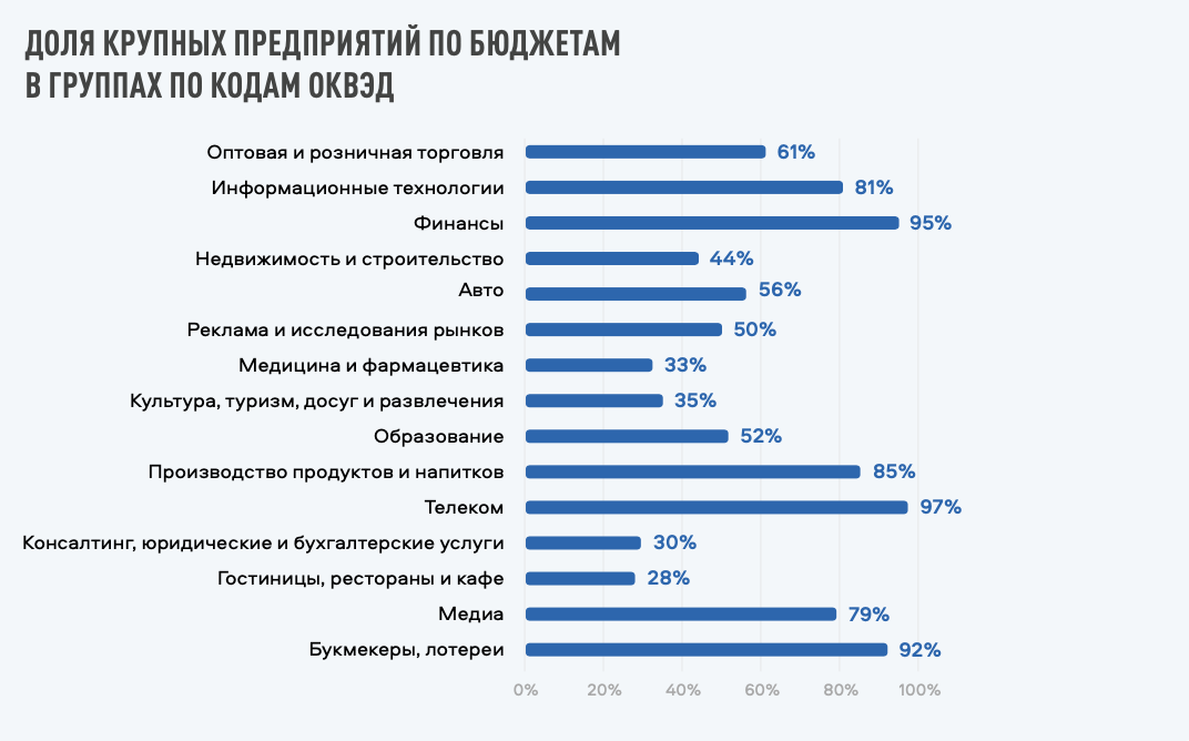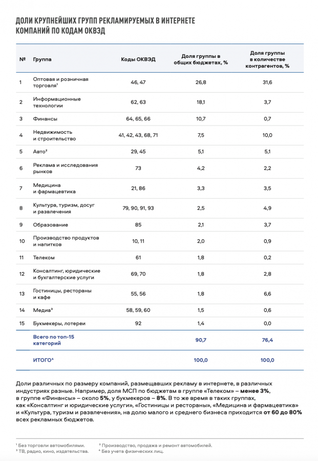 Лидером по доле рекламных бюджетов в разрезе ОКВЭД стала группа «Оптовая и розничная торговля» (26,8%), за которой следуют «Информационные технологии» (18,1%) и «Финансы» (10,7%). На лидера пришлось почти 32% всех рекламодателей. Но при этом средний размер рекламного бюджета оказался весьма небольшим — чуть более 1,2 млн руб.