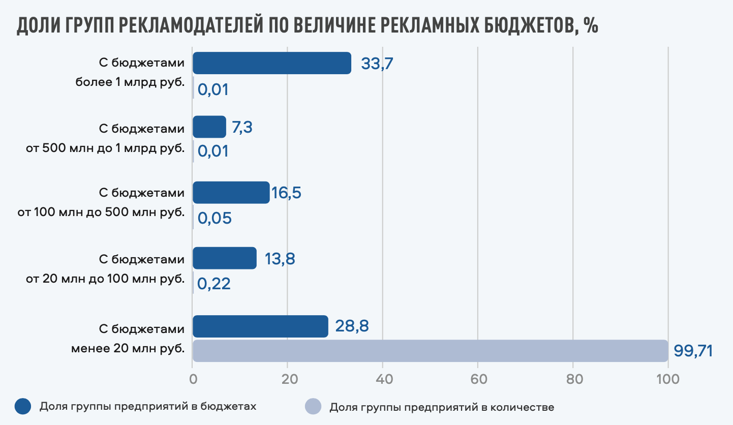 Треть всех рекламных бюджетов в интернете приходится на 96 крупнейших рекламодателей (суммарно около 290 млрд руб.), каждый из которых потратил более 3 млрд руб. При этом их количество составило всего 0,01% от общего числа рекламодателей в интернете.