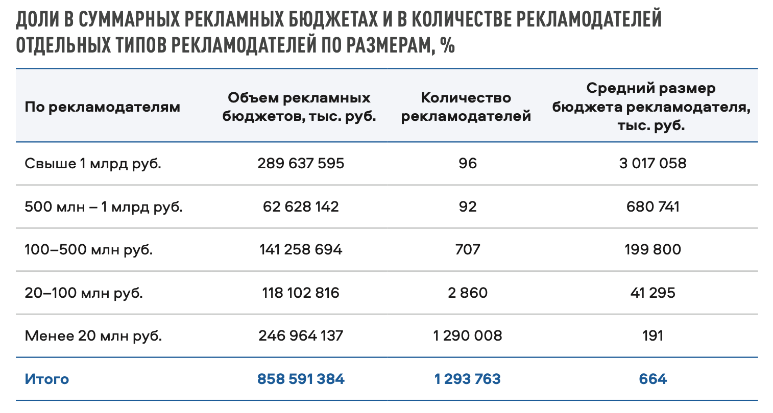 Наиболее активными стали крупные рекламодатели, составившие всего 2,5% от общего числа, но обеспечившие 60,1% всех бюджетов. Средний рекламный бюджет компании в 2024 году составил 663,6 тыс. руб.