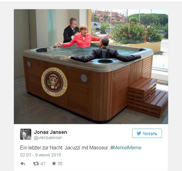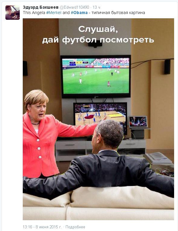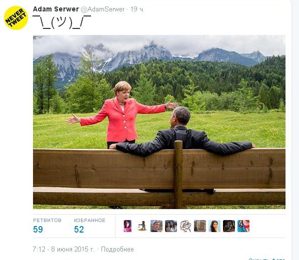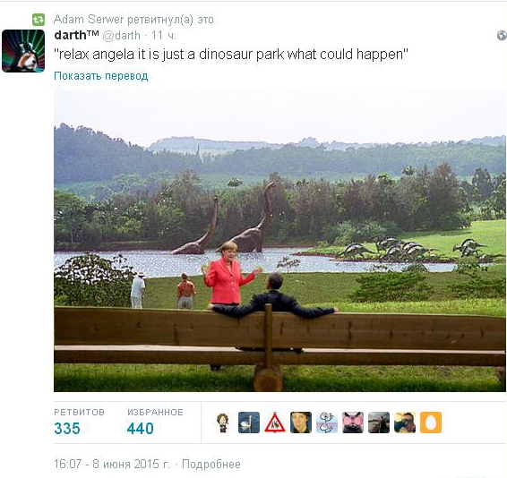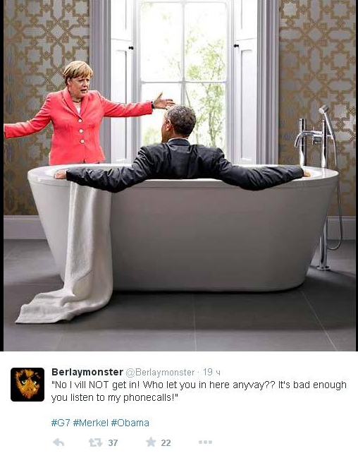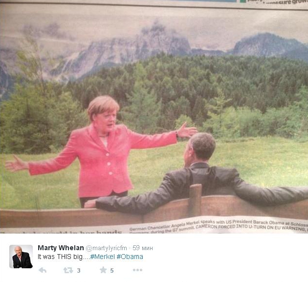 Эмоциональный снимок разговора глав государств сильно впечатлил пользователей соцсетей; фотографию сравнили с известным фильмом-мюзиклом «Звуки музыки», события которого разворачиваются в австрийских Альпах. Также в Twitter появилось огромное количество фотожаб, в которых весьма двусмысленно обыгрываются как поза Обамы, так и жест Меркель.