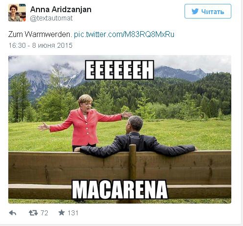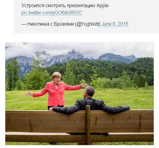 Интернет-пользователи вновь взялись за создание фотожаб с Бараком Обамой и Ангелой Меркель. Поводом для новых шуток и ироничных подписей стала фотография политических деятелей на фоне Альп, сделанная в ходе саммита G7.