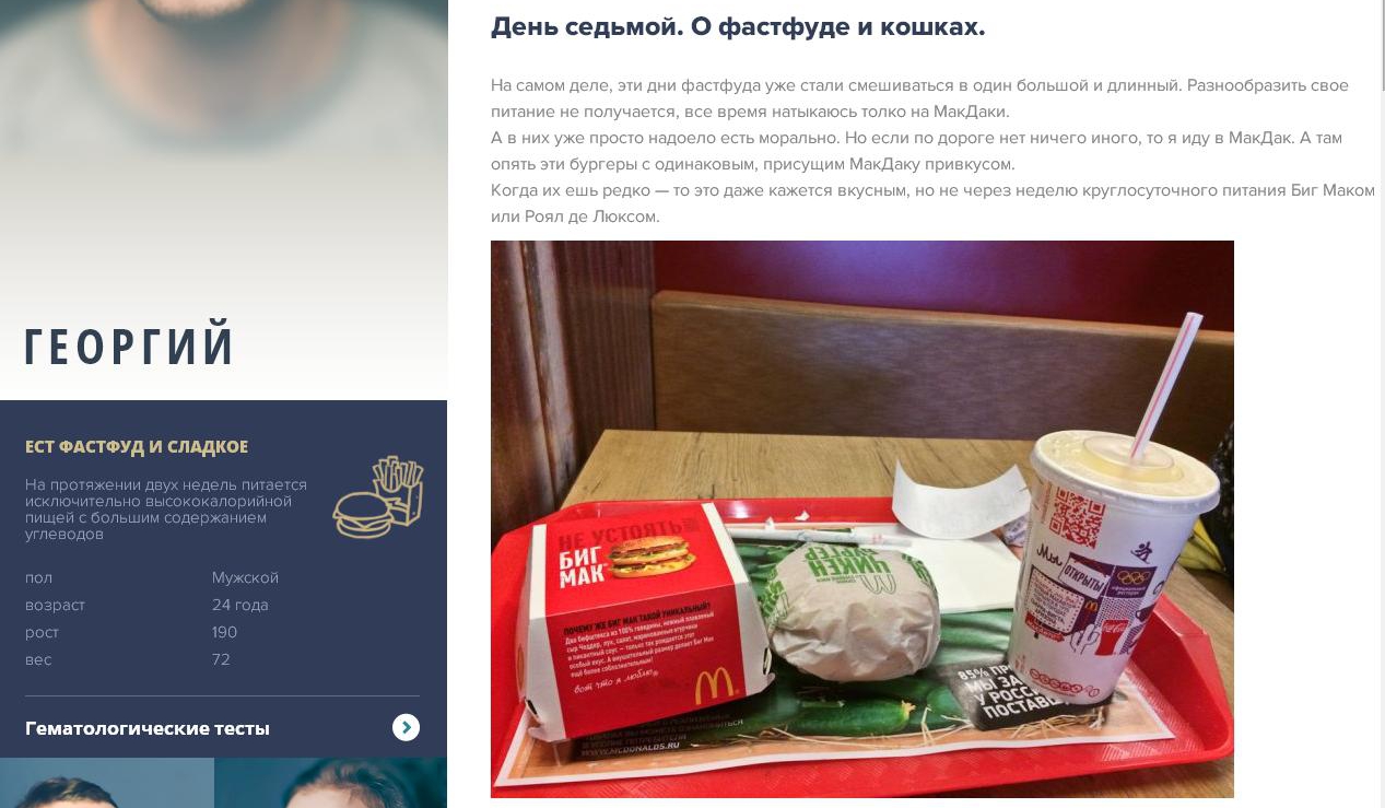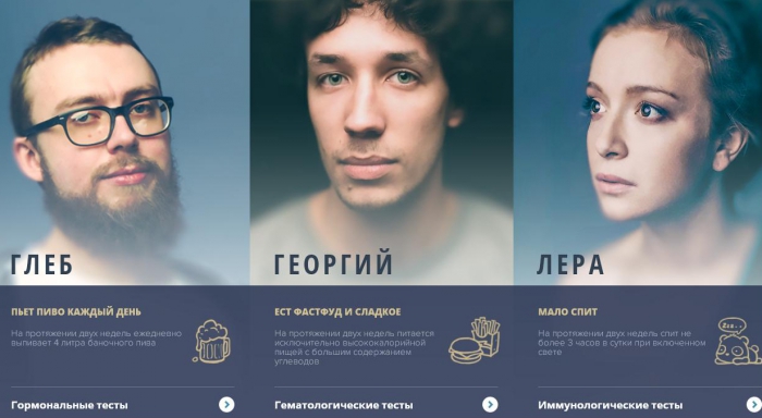 Независимая лаборатория «Инвитро» решила показать, как ежедневные вредные привычки сказываются на состоянии здоровья, самым наглядным образом, запустив проект под названием #Анализируйэто вместе с командой Bigpicture. В рамках проекта участвовать в эксперименте согласились три добровольца, которые 2 недели будут страдать от недосыпа, ежедневного употребления фастфуда и легкого алкоголя.