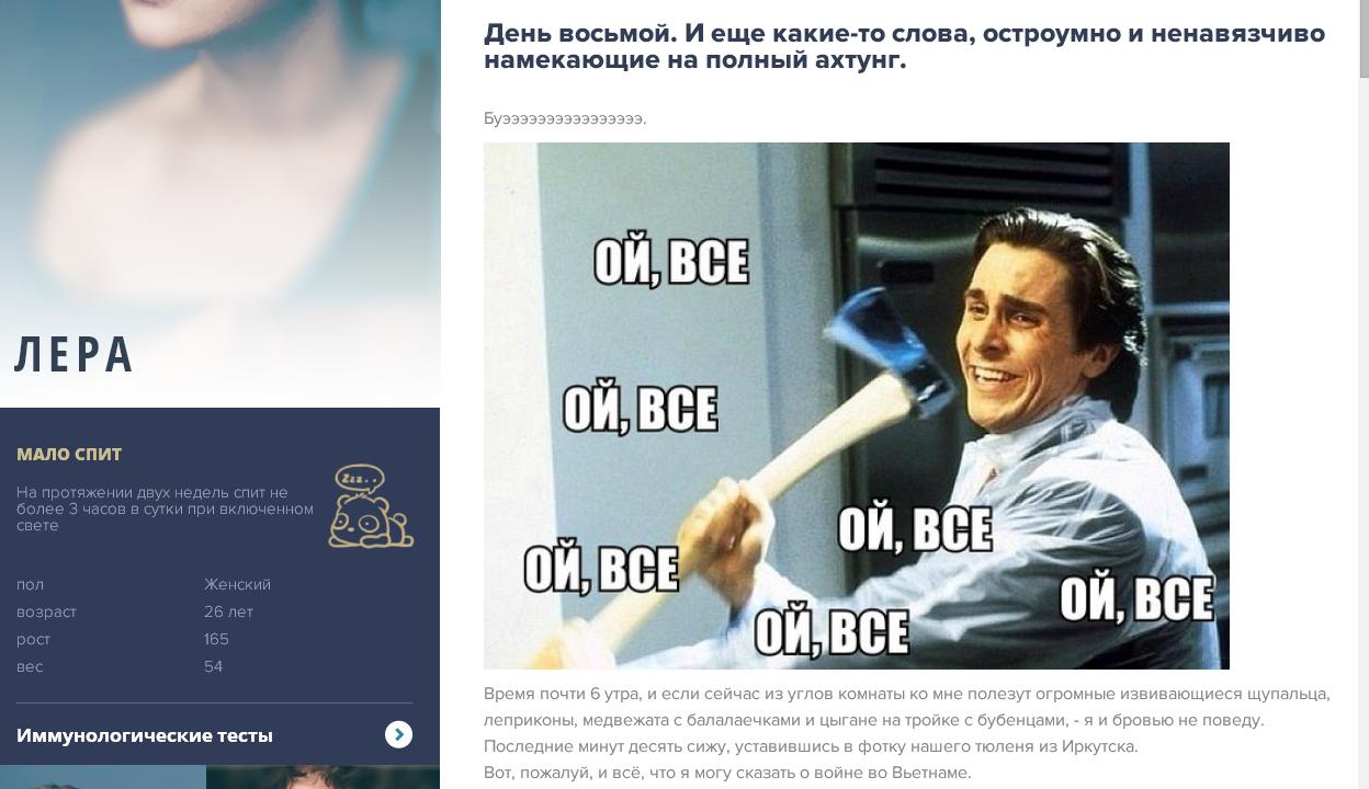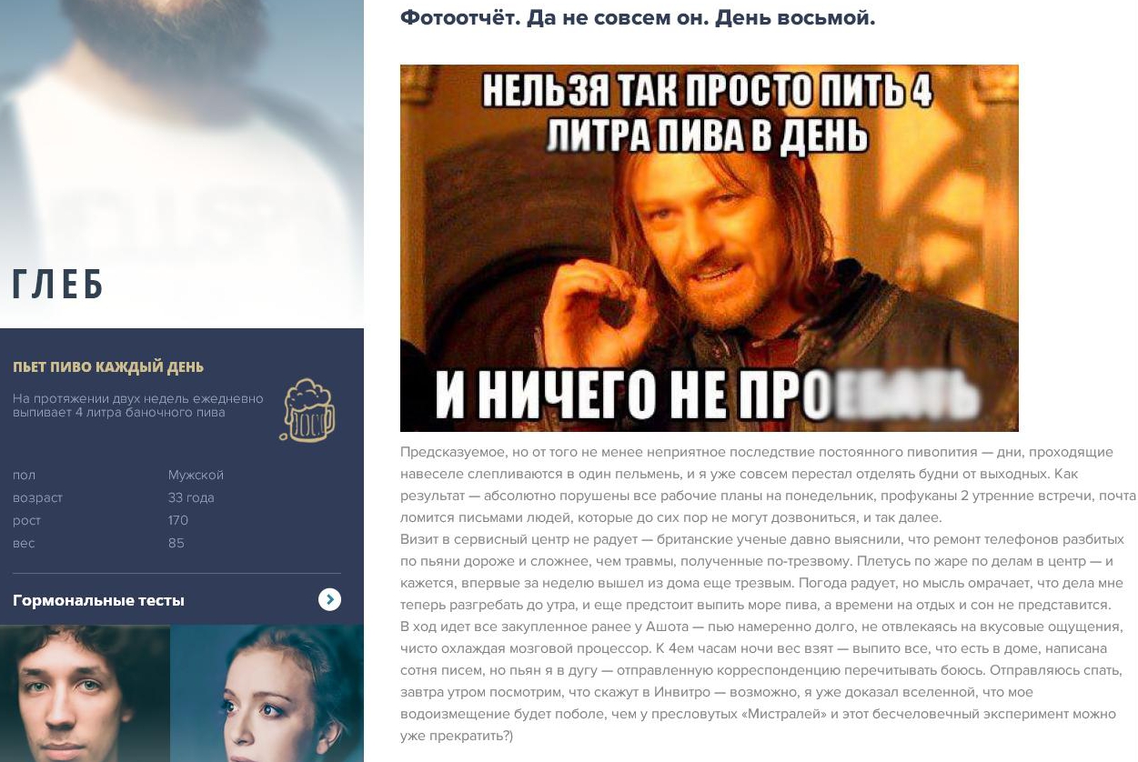 В «Инвитро» влияние привычных всем «пороков» на организм решили показать на трех реальных людях. Одна из них - Лера Волкова – сотрудница Bigpicture.ru. Девушка сама выбрала себе в испытания бессонницу и хотела проверить, насколько хватит ее сил. Второй участник проекта Георгий Малец ест фастфуд и, как признается он сам, это для него не испытание, а наслаждение. Третий герой – Глеб Лисичкин - по условиям эксперимента, должен каждый день пить пиво.