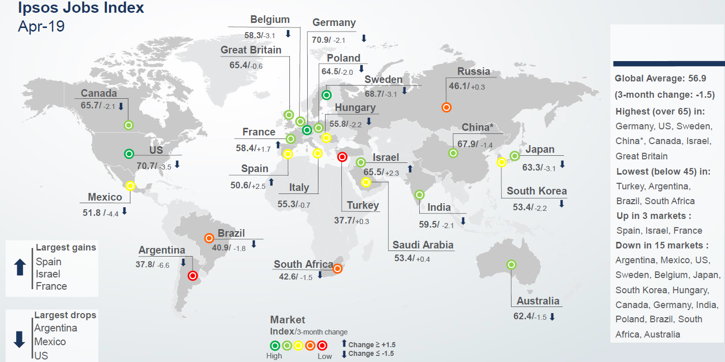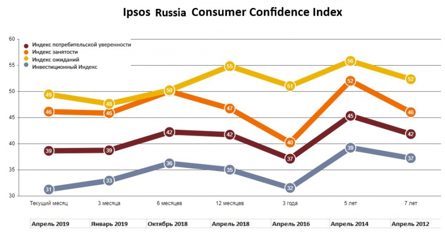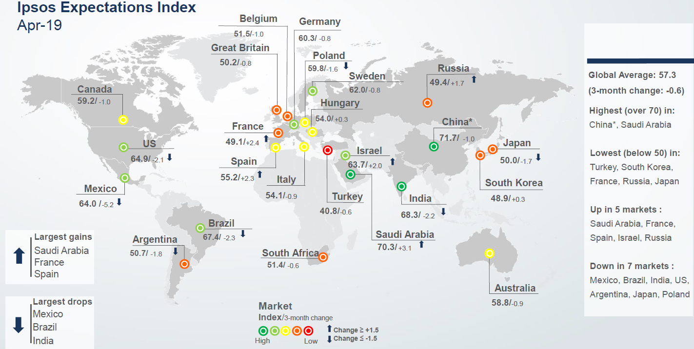 Настроения потребителей, в среднем по миру, за последние три месяца стали более пессимистичны, как это следует из обнародованного в апреле 2019 года отчета компании Ipsos.