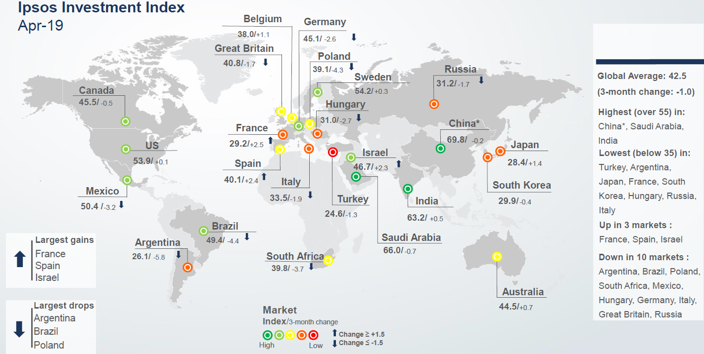 Согласно данным проводимого ежемесячно исследования Ipsos Consumer Confidence Index средний уровень потребительской уверенности чуть ниже среднего и составляет 49 пунктов из 100 возможных. Наивысшие показатели у Китая (69,6), Саудовской Аравии (64,4), Индии (62,4) и США (60,2). Самые высокие темпы роста Индекса за последние три месяца продемонстрировали Испания (+2,5), Израиль (+2,4) и Франция (2,2). Россия с показателем 38,6 находится в группе стран с наиболее низкими показателя Индекса ,среди которых также Турция (31,8), Аргентина (33,1) и Южная Корея (39,7). Всего в проекте участвуют 24 страны.