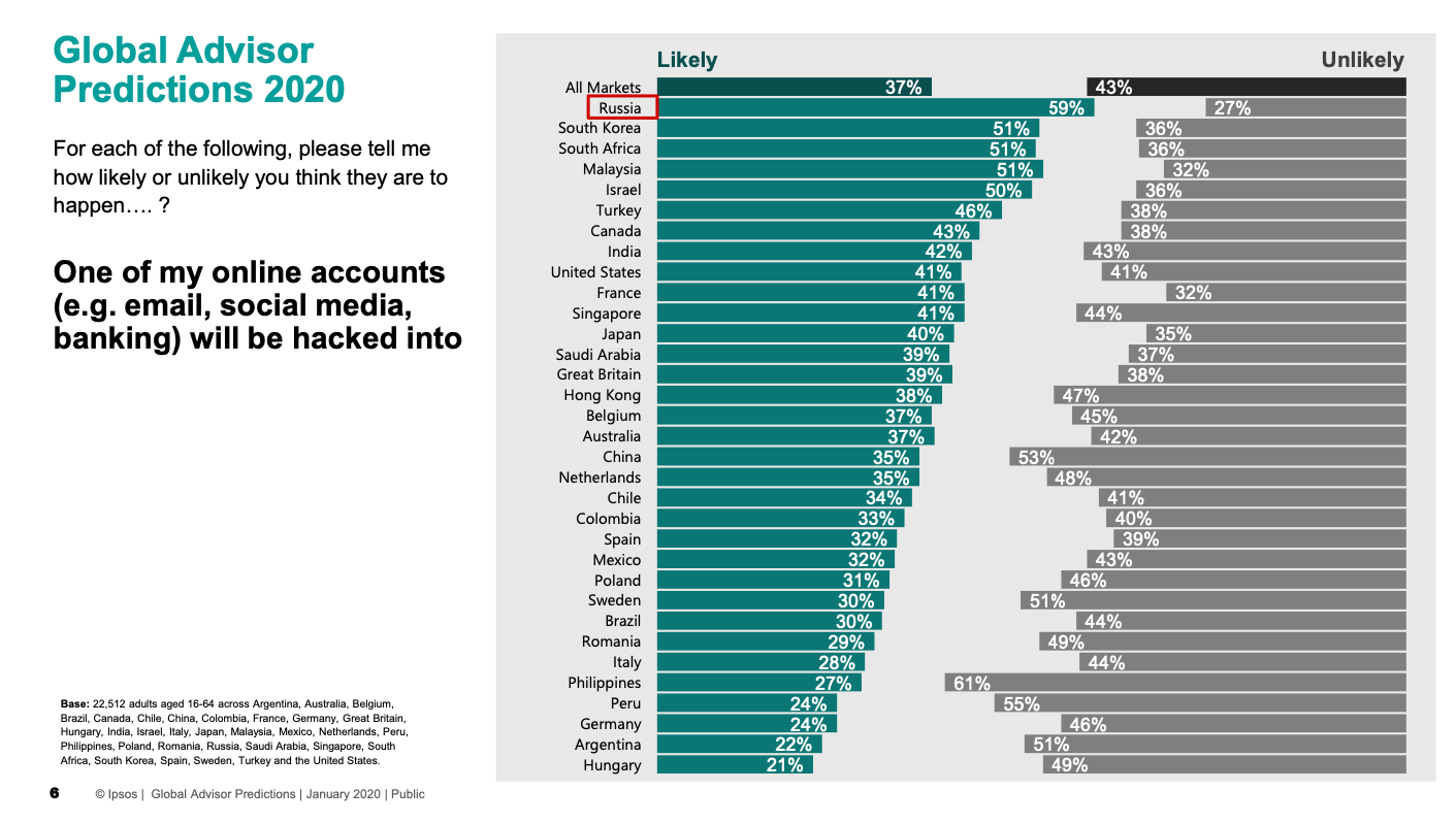 Россияне больше, чем жители других стран, опасаются, что их аккаунты в социальных сетях могут взломать, следует из исследования Ipsos Predictions 2020. Этого боятся 59% россиян, в то время как средний показатель по миру — 37%. Среди стран, жители которых также беспокоятся о безопасности своих соцсетей, — Южная Корея, ЮАР и Малайзия. Там этот показатель составляет 51%.