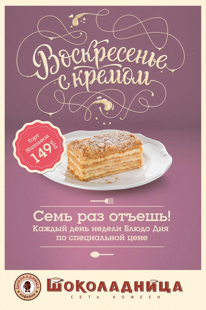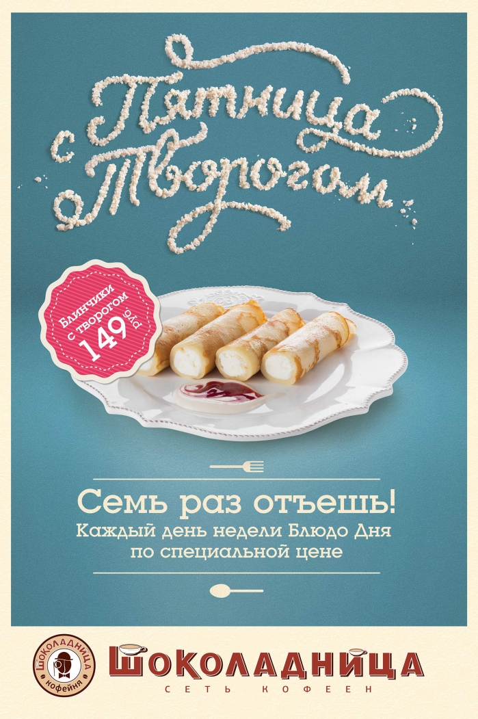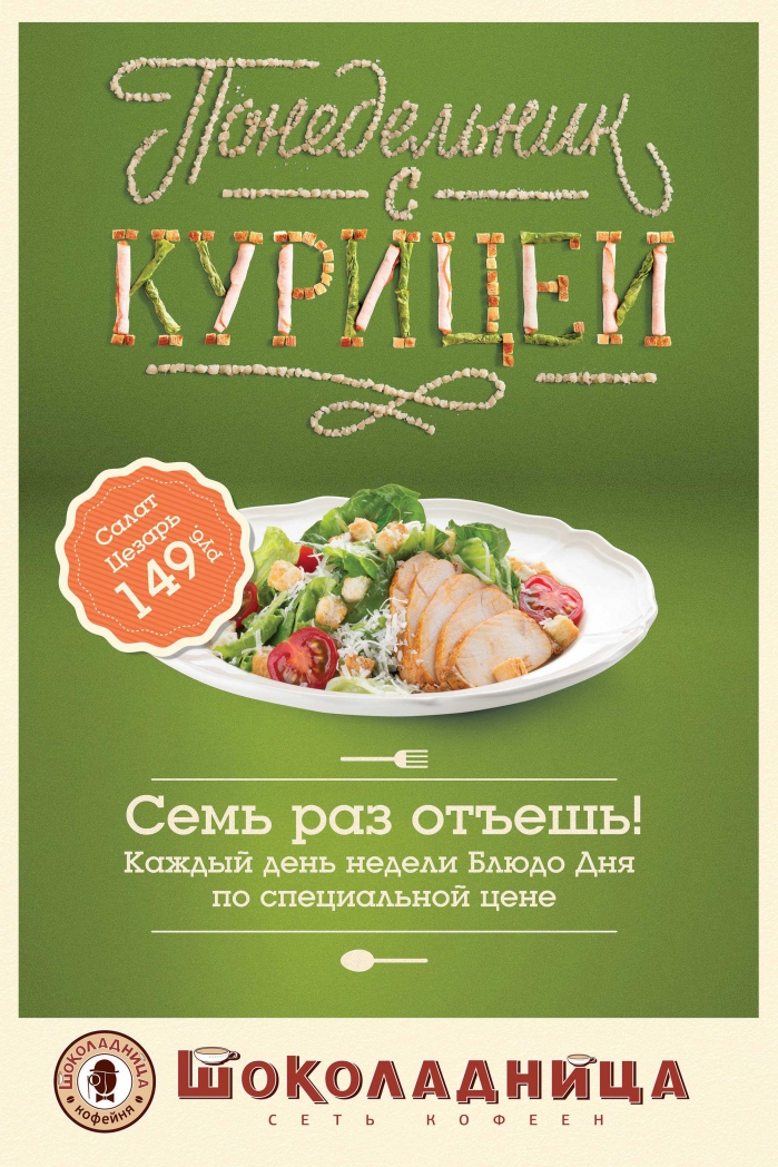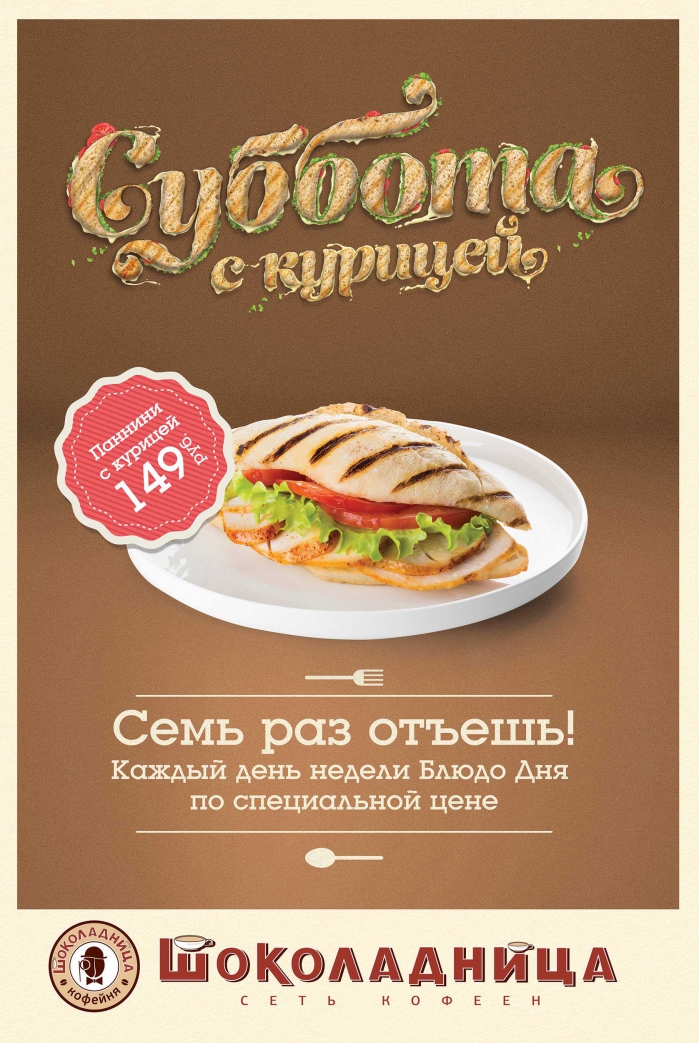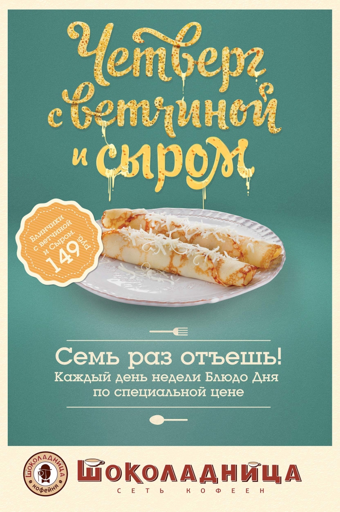 Кампания продвигает акцию Шоколадницы, по которой каждый день недели блюдо дня продается с большой скидкой. Сначала креаторы придумали слоган кампании «Семь раз отъешь».