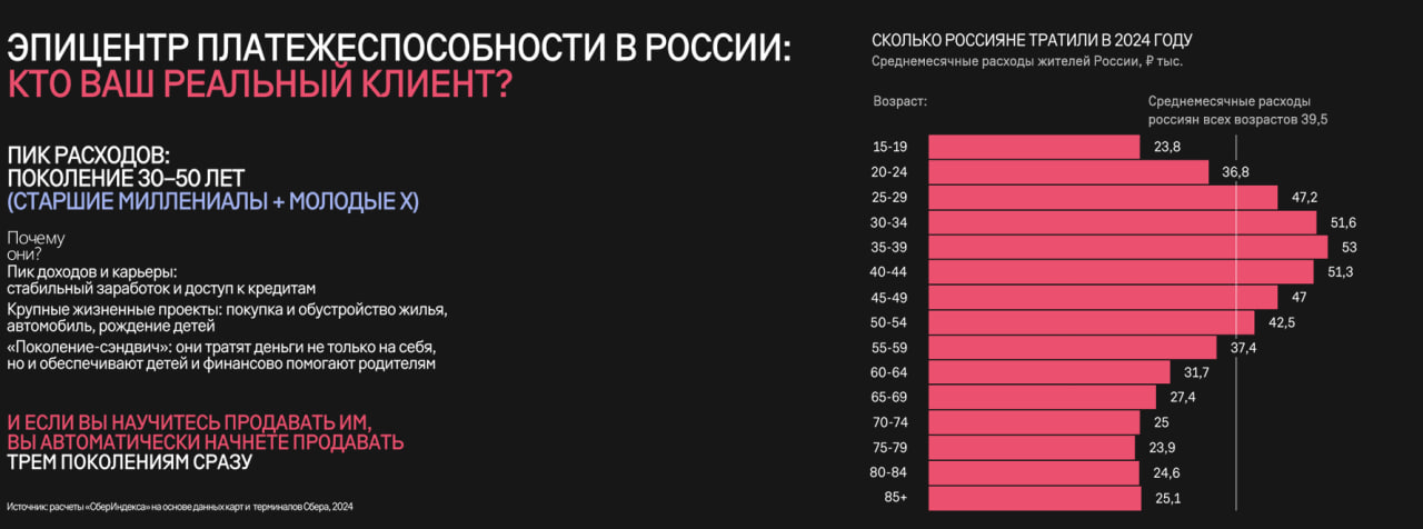 Общемировые тренды показывают, что больше всех трат по сравнению с другими поколениями приходится на поколение Х (45−60 лет). Российские исследования рисуют похожую картину. Сегодня каждый второй россиянин старше сорока лет, и около трети — старше пятидесяти пяти. Возраст, в котором люди могут позволить себе крупные покупки постоянно увеличивается. По данным «СберИндекса», пик покупательской активности у среднего российского потребителя происходит около 35−50 лет.