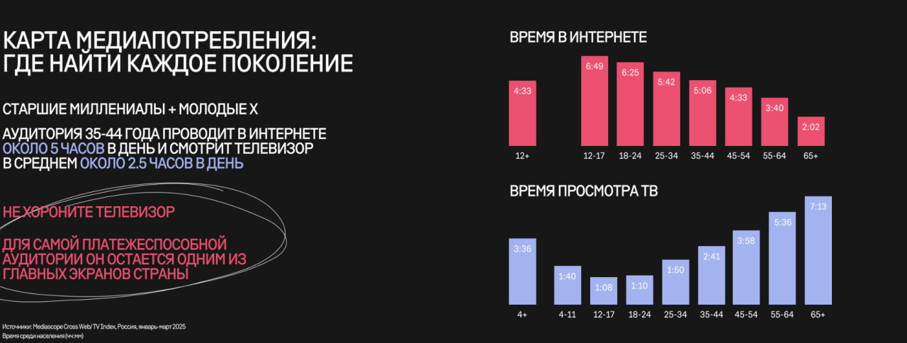 Это означает, что именно эта возрастная группа формирует основную долю расходов в категориях с высоким средним чеком и длинным циклом принятия решения: недвижимость и ремонт, автомобили, бытовая техника и электроника, образование и здоровье, семейные путешествия и страховые продукты. Для брендов это аудитория, напрямую влияющая на выручку и маржинальность, а не только на охват.