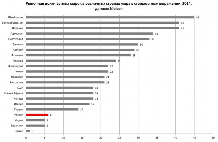Частные марки принадлежат розничным торговцам, соответственно, их успех и представленность на рынке напрямую зависят от рыночных позиций их владельцев. По исследованиям Nielsen, в странах Западной Европы на Топ-10 розничных сетей приходится 62–90% рынка в стоимостном выражении, а доли частных марок составляют в среднем 37%, с диапазоном от 17 до 45%. В России же на ведущие 10 розничных сетей в 2014 г. пришлось 19% рынка. Исходя из текущего уровня консолидации российского рынка, некорректно было бы ожидать более высокого проникновения частных марок.