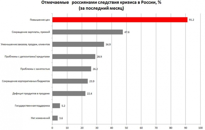 Елена Хлюпова, Генеральный директор COMCON Research Company отмечает: «Главным показателем экономического кризиса конца 2014 года стал рост цен. В январе уже 91% экономически активного населения городов-миллионников сообщили, что они или их родственники за последний месяц ощутили удорожание, а 86% респондентов отметили рост цен на продукты питания. При этом 48% респондентов или их родственников столкнулись с проблемой сокращения зарплат или премий. Также необходимо отметить такую особенность нового кризиса как дефицит продовольствия в продаже. Если в разгар прошлого кризиса – в 1 квартале 2009 года дефицит продовольствия отмечали всего 9% респондентов, то в январе 2015 об этом заявили уже 22% опрошенных».