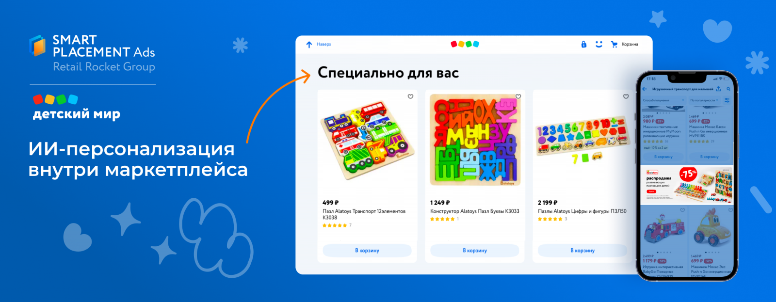 Нишевый маркетплейс «Детский мир» интегрировал в свою ecom-инфраструктуру (сайт и мобильное приложение) инструмент предиктивной аналитики и персонализированной рекламы Smart Placement Ads от Retail Rocket Group. Новое adtech-решение работает на базе технологий big data и машинного обучения и позволит онлайн-площадке получать дополнительный доход за счёт монетизации своего трафика, а рекламодателям — добиваться трёхзначного возврата инвестиций в рекламу.