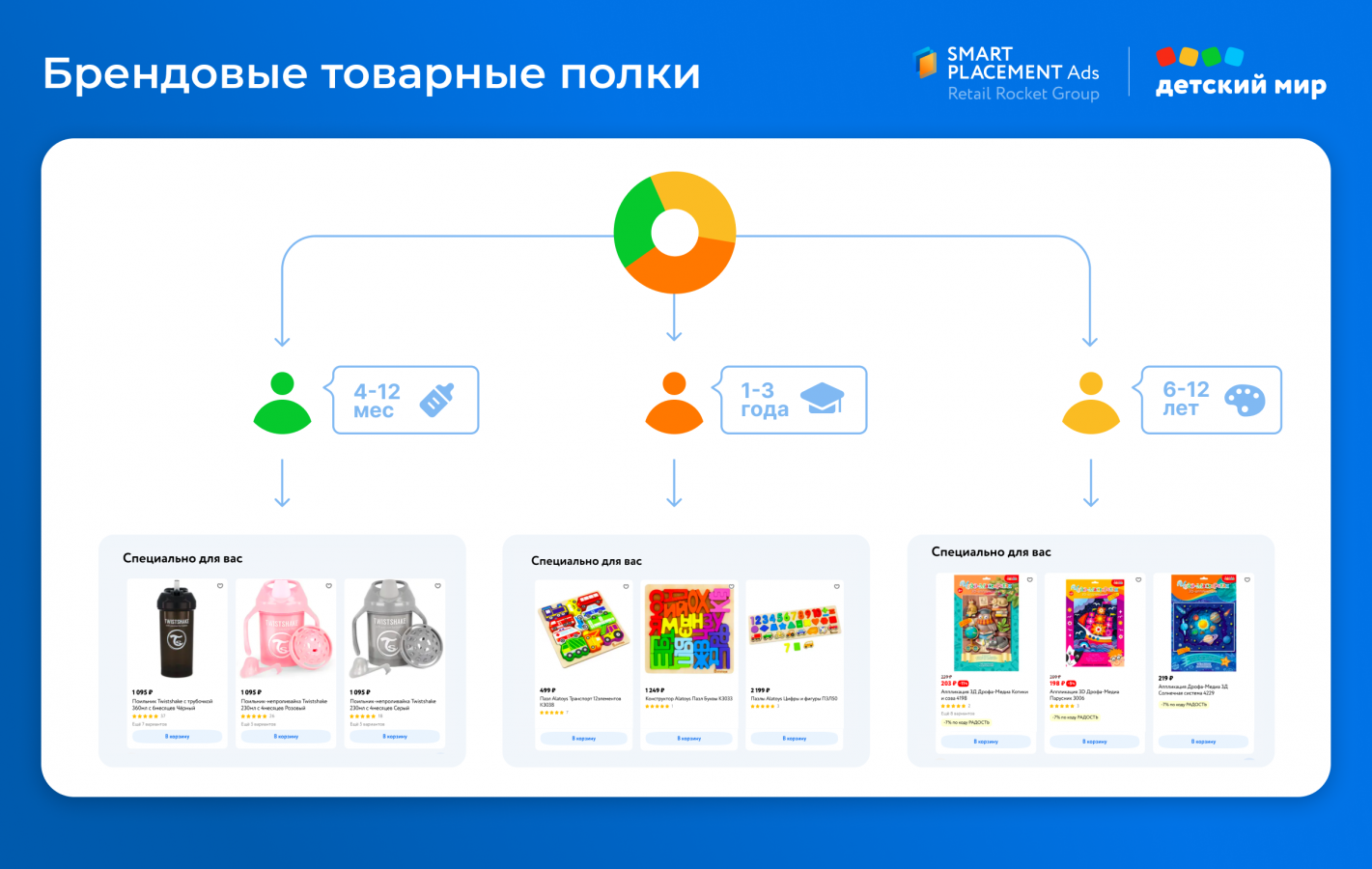 На данный момент в инфраструктуру «Детского мира» внедрено более 30 рекламных плейсментов. Размещения возможны на каждой странице сайта и мобильного приложения маркетплейса: на главной, в поиске, каталоге, на страницах товаров, избранного, личного кабинета, корзины и заказа. Это позволяет селлерам демонстрировать индивидуальные рекламные сообщения на всех этапах покупательского маршрута.
