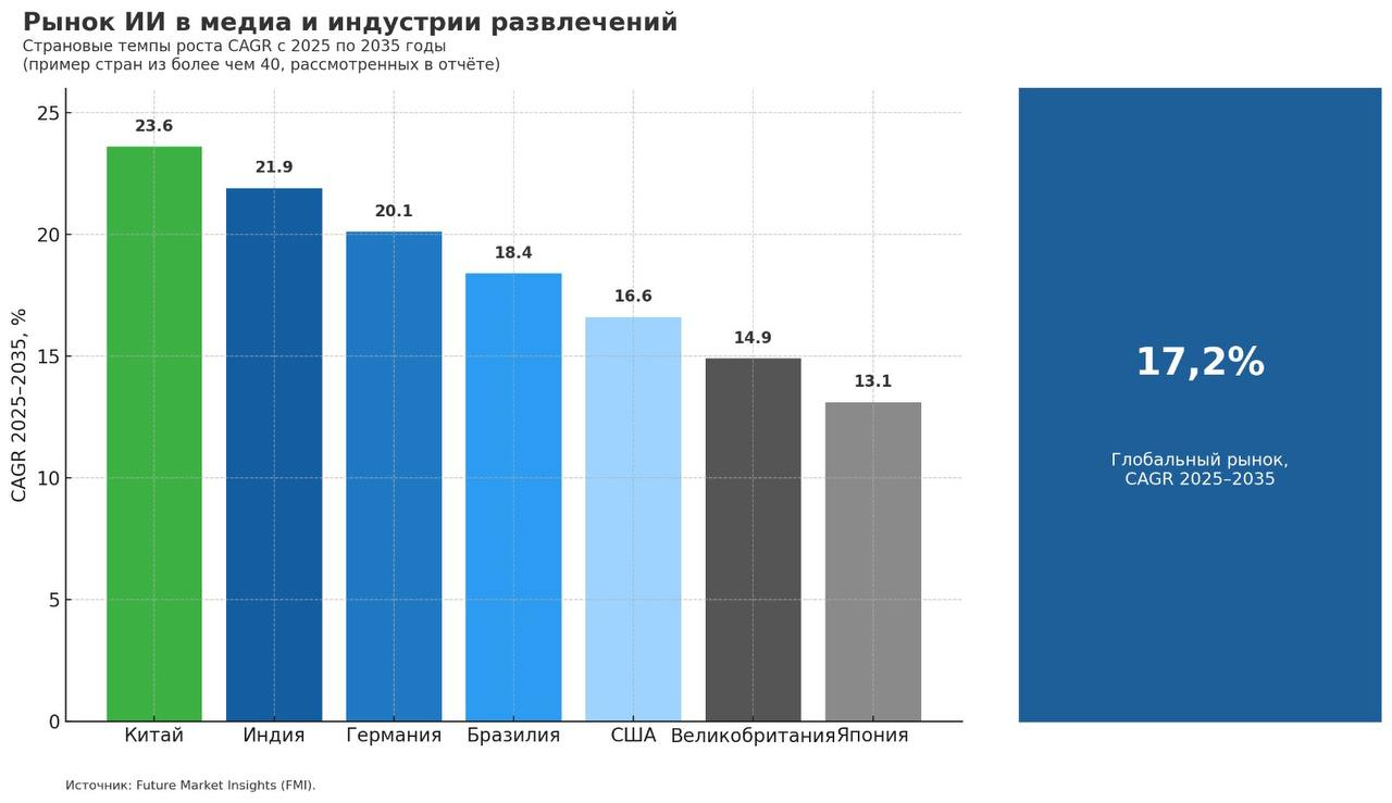 Китайский рынок, например, отличает быстрая, управляемая сверху интеграция ИИ-инструментов для создания контента в замкнутые «супер-приложения». (TikTok, CapCut, Alibaba). Например, государственное информационное агентство Xinhua используют AI-дикторов новостей для ведения круглосуточного вещания, минимизируя производственные затраты.